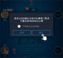 · 当玩家在比赛中筹码被清零时,在比赛中会弹出提示框。若玩家勾选不再提示此类消息,点击确定按钮后,将认定玩家选择自动重进。