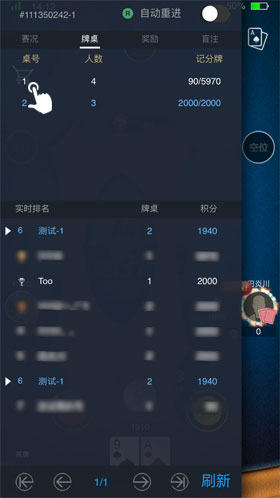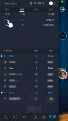 在锦标赛中,玩家看到的有关比赛的数据非实时刷新,包括各个玩家筹码量、平均记分牌、比赛剩余人数等,若玩家想要获知最新的数据,需要点击刷新按钮或者向下滑动屏幕以触发刷新,获知最新的比赛详情。