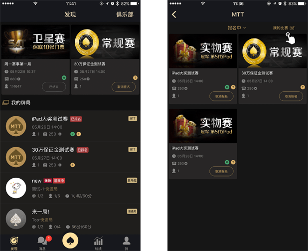 · 在发现页中的下方我的牌局中,玩家已报名未开始的比赛会置顶在列表最上方。